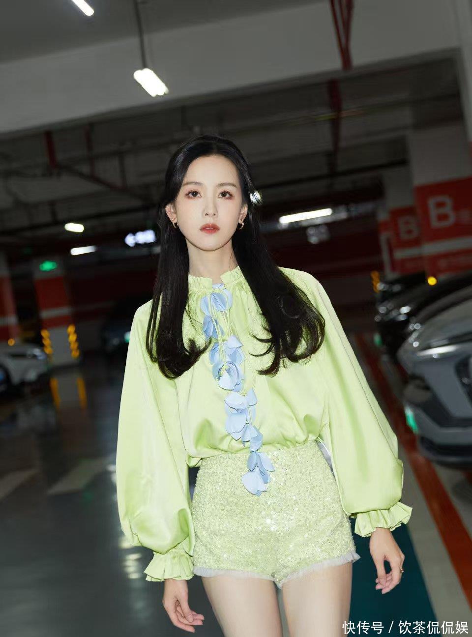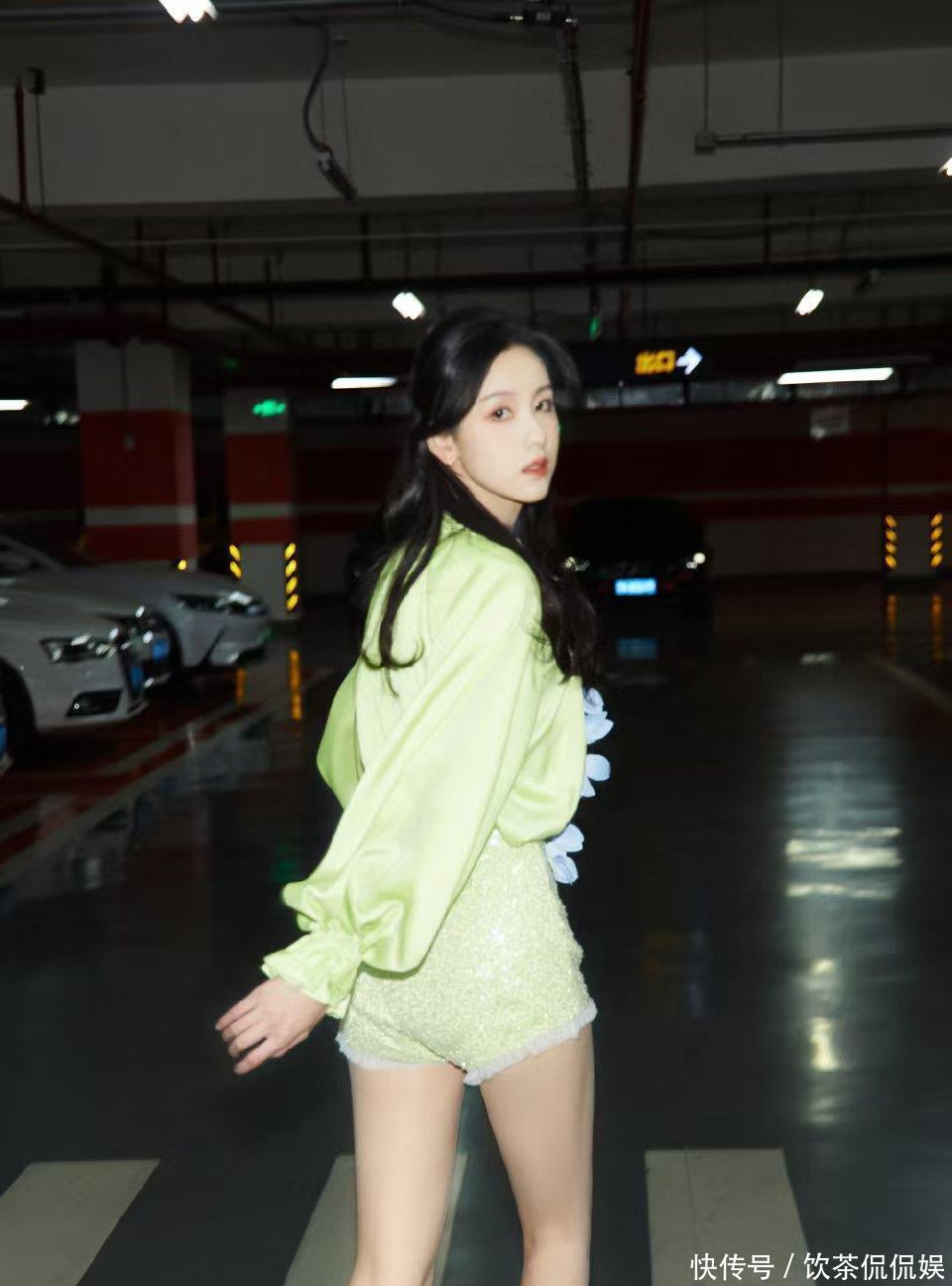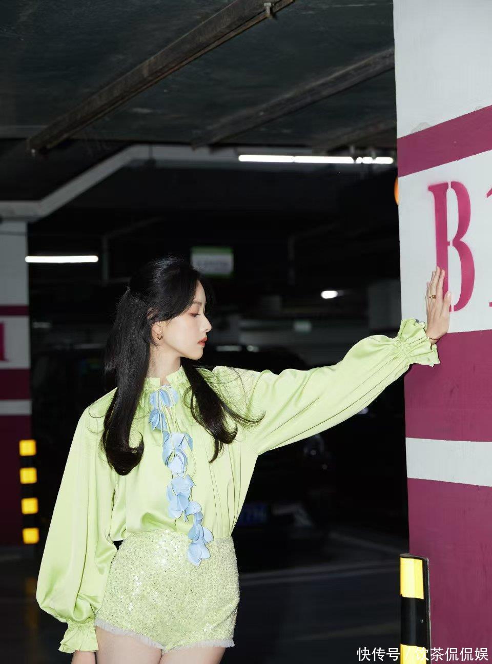 而她的“露腿杀”,更是让镜头都忍不住“失焦”。笑着挥手的瞬间,荧光绿套装掐出的蚂蚁腰随着动作轻轻晃,亮片短裤下的白腿又直又匀,连背景里的工作人员都成了模糊的陪衬——这甜笑+长腿的双重暴击,谁看了能不心动?
