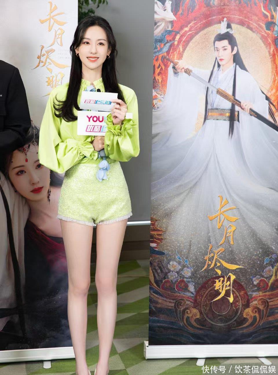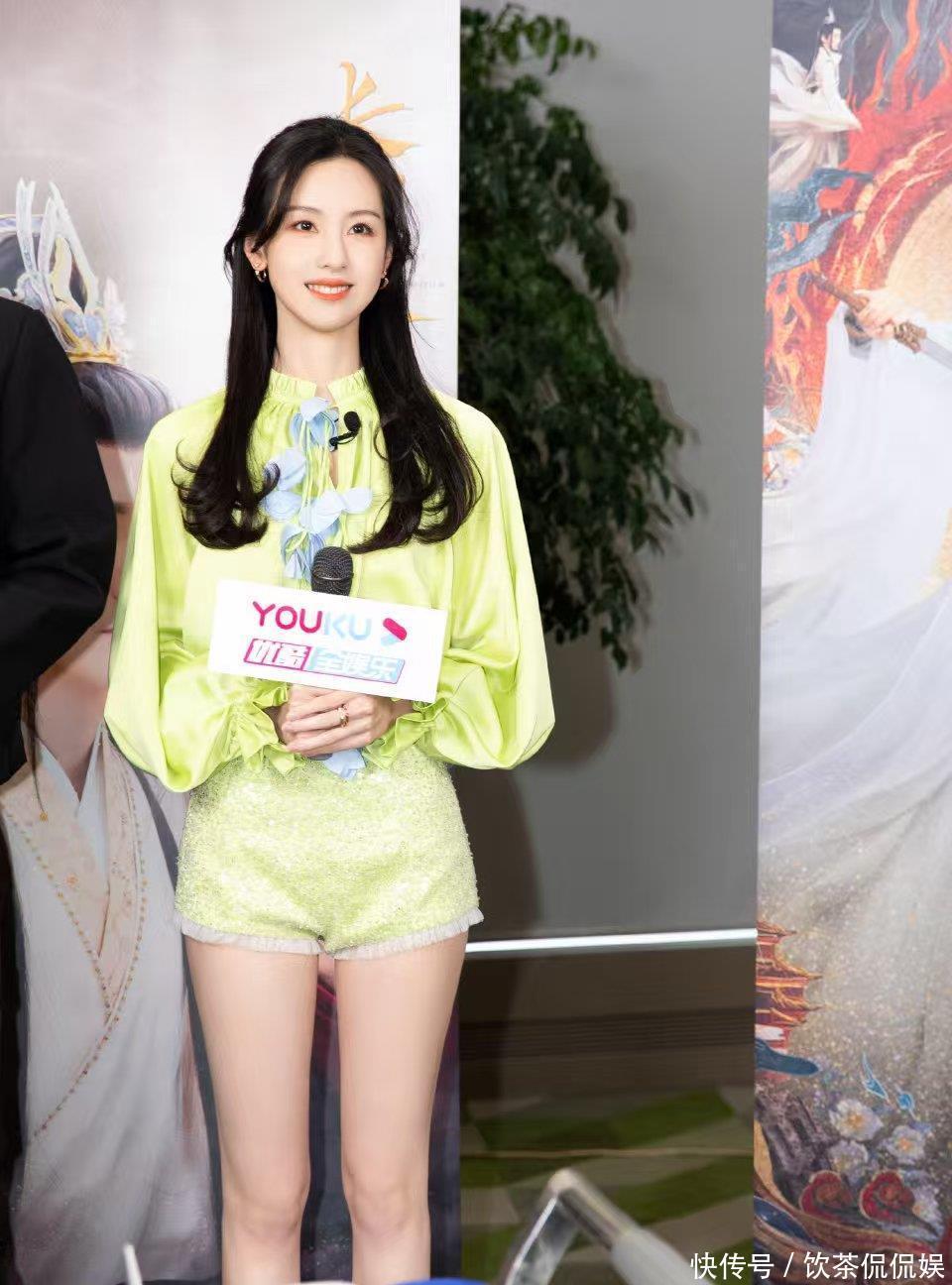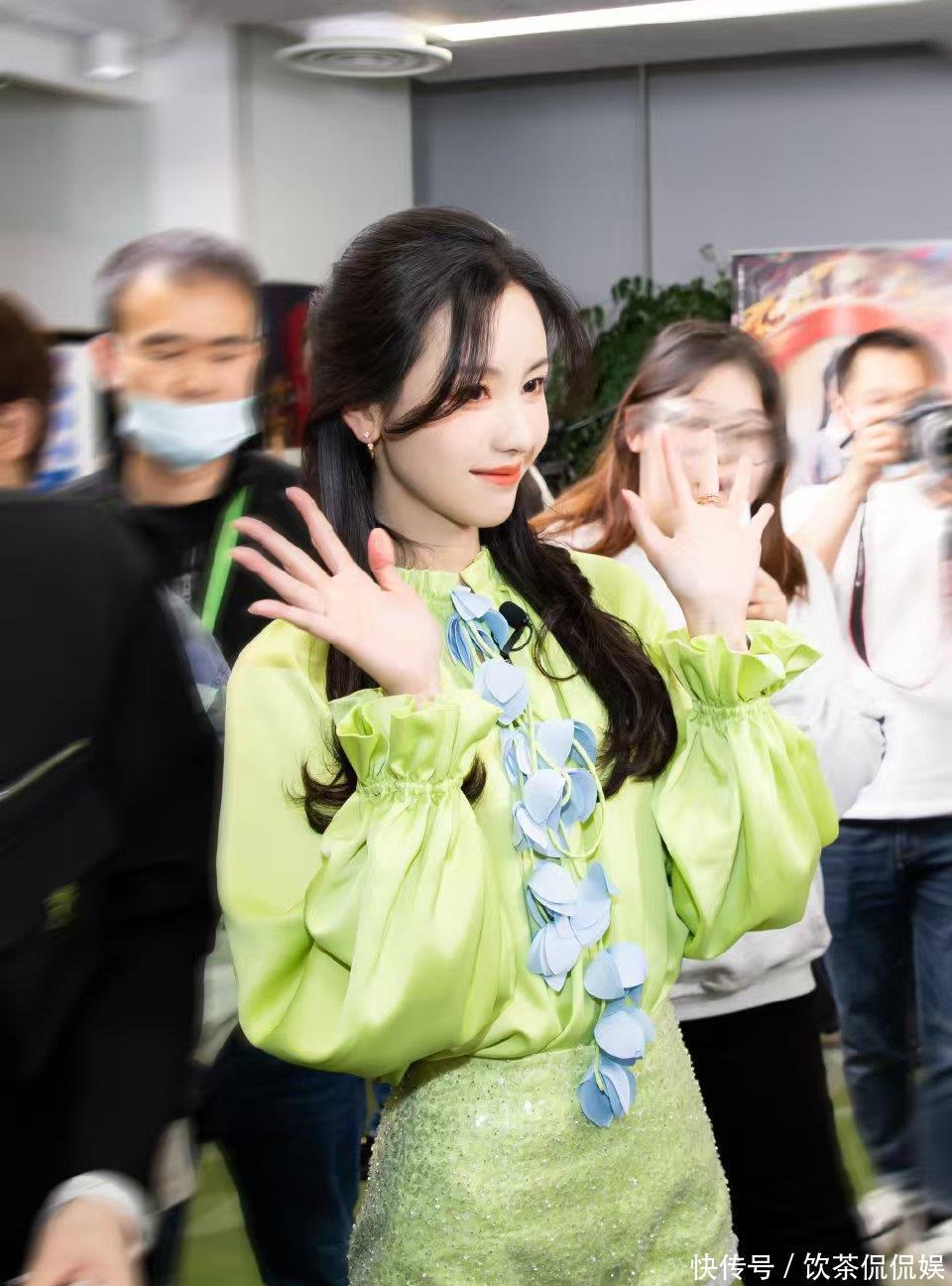 而她的“露腿杀”,更是让镜头都忍不住“失焦”。笑着挥手的瞬间,荧光绿套装掐出的蚂蚁腰随着动作轻轻晃,亮片短裤下的白腿又直又匀,连背景里的工作人员都成了模糊的陪衬——这甜笑+长腿的双重暴击,谁看了能不心动?